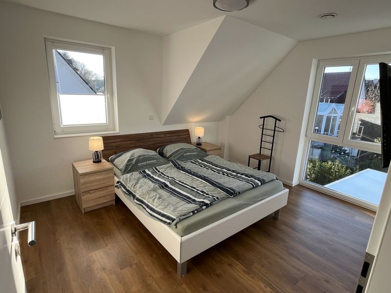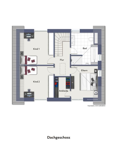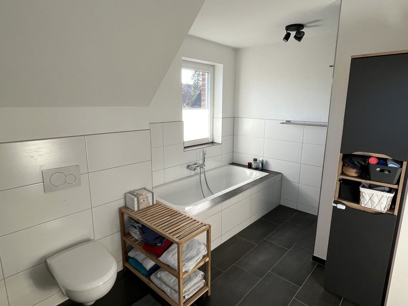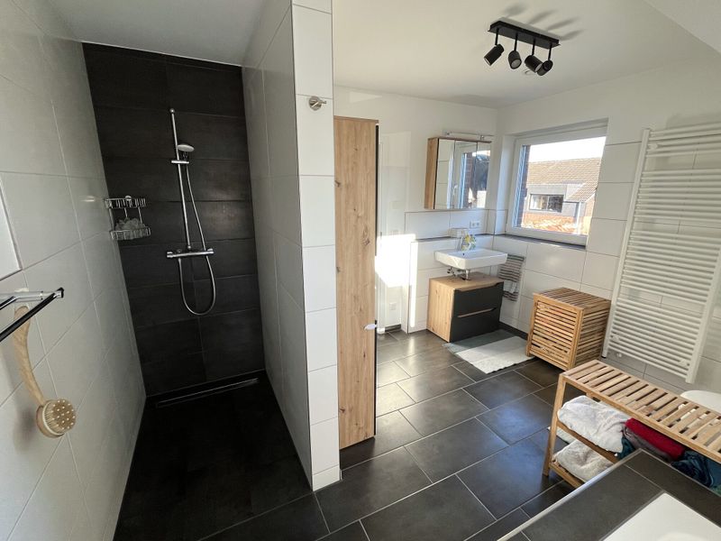 Im Obergeschoss erwarten Sie drei vielseitig nutzbare Schlafzimmer, die dank durchdachter Raumaufteilung maximale Entfaltungsmöglichkeiten bieten, ob als Kinderzimmer, Homeoffice oder Gästezimmer. Das stilvolle Badezimmer überzeugt mit moderner Ausstattung, Dusche und Badewanne und wird so zur persönlichen Wohlfühloase.
