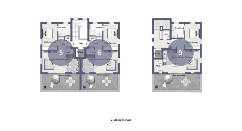 Im Dachgeschoss entfalten die Zwei-Zimmer-Wohnungen mit etwa 65 bzw. 83 m² ihren besonderen Charme. Sie schenken den Bewohnern nicht nur durchdachte Grundrisse, sondern auch großzügige Dachterrassen, die wie private Oasen wirken und ein unvergleichliches Gefühl von Freiheit vermitteln.