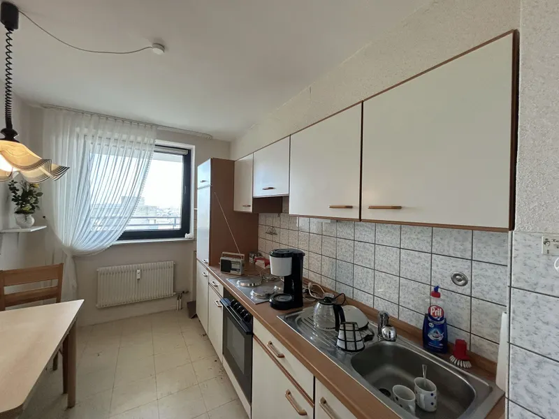 Die durchdachte Grundrissgestaltung umfasst insgesamt drei Zimmer und eignet sich ideal für Singles oder Paare. Herzstück der Wohnung ist der großzügige Wohnbereich mit Zugang zur großen Loggia – von hier genießen Sie einen schönen Blick über die Stadt. Die Küche ist in einem separaten Raum untergebracht. Ein Tageslichtbad rundet das Raumangebot ab.