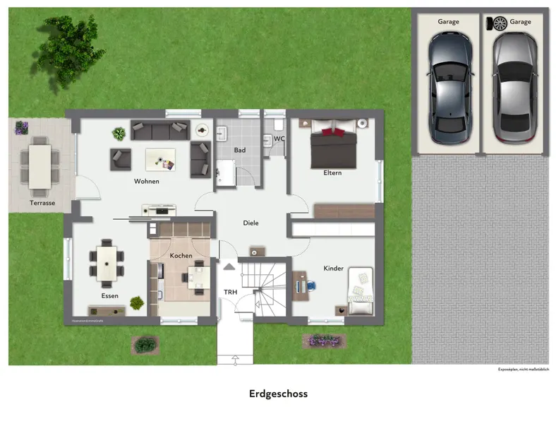– zwei Garagen und zwei Stellplätze im Freien