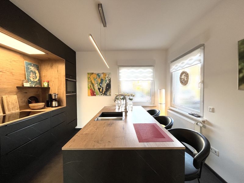 Das Erdgeschoss empfängt Sie mit einem beeindruckenden, offenen Wohn- und Essbereich, der durch ein schönes Anbau-Element mit Wintergartencharakter erweitert wurde. Hier können Sie das ganze Jahr über viel Tageslicht genießen. Die hochwertige Ausstattung des Hauses wird durch eine moderne Einbauküche ergänzt, die den kulinarischen Mittelpunkt des Hauses bildet.