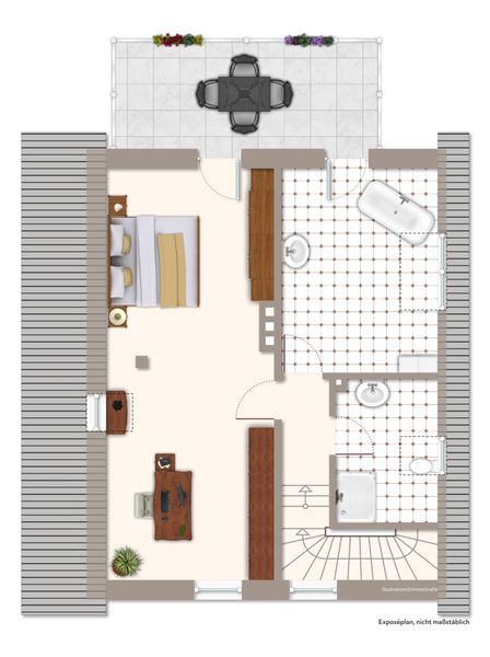 Im Dachgeschoss wartet ein großzügiger Schlafbereich auf Sie, der flexibel in ein Eltern- und ein Kinderzimmer umgewandelt werden kann. Die beiden neuwertigen Bäder lassen keine Wünsche offen: Ein kleines Bad ist mit Dusche, WC und Waschbecken ausgestattet, während das große Bad (ursprünlgich ein großes Kinderzimmer) mit einer freistehenden Badewanne, einem Waschbecken und einem Handtuchheizkörper für entspannte Momente sorgt.
