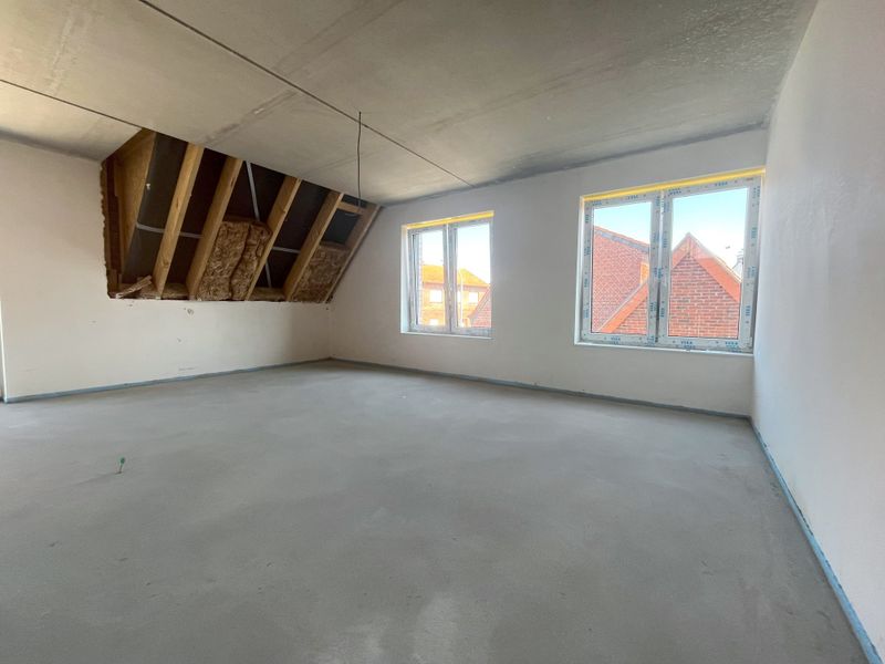 Sie gelangen in die geräumige Diele mit Zugang zum Hauswirtschaftsraum, Platz für Garderobe und Durchgang zum offenen Wohn-Essbereich mit offener Küche und Balkon. Ein modernes Tageslichtbad fehlt auf dieser Ebene selbstverständlich nicht. Ebenfalls von der Diele abgehend befinden sich zwei geräumige Schlafzimmer und die Treppe in den Spitzboden. Hier befindet sich ein weiteres geräumiges Zimmer und ein separates WC.