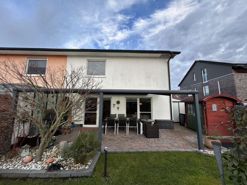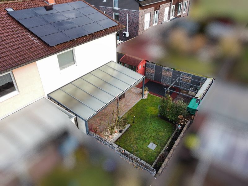 Bodentiefe Fenster des Wohnzimmers und ein Zugang zur überdachten Terrasse mit elektrischer Markise von 2022, ziehen den Blick auf den neu gestalteten kleinen Garten mit Gartenhäuschen – perfekt für entspannte Stunden mit Familie und Freunden. Auch von hier gelangen Sie direkt zum Carport. Der Zugang Richtung Carport ist mit einer elektrischen Rolllade zu verschließen, so dass ungebetene Gäste nicht einfach im Garten stehen können.