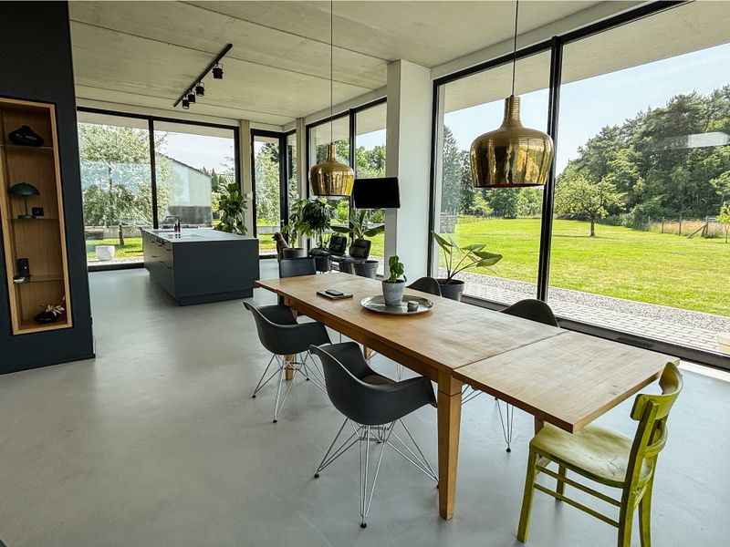 Das offen gestaltete Grundrisskonzept verteilt sich auf ca. 173 m² Wohnfläche und überzeugt mit klaren Linien, lichtdurchfluteten Räumen und einer außergewöhnlich hochwertigen Ausstattung. Große Fensterfronten lassen viel Tageslicht herein und eröffnen beeindruckende Blickachsen in den weitläufigen Garten. Ein besonderes Highlight sind die Raumhöhen und Materialien im angesagten Industrie-Look: Sichtbeton-Elemente, Details in Schwarz und graue Betonoptikböden verleihen dem Haus eine moderne, urbane Atmosphäre mit hohem Designanspruch.