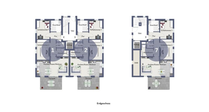 Beide Häuser erfüllen den KfW-40-Standard und setzen mit einer Luft-Wasser-Wärmepumpe sowie einer Photovoltaikanlage auf eine nachhaltige Energieversorgung.