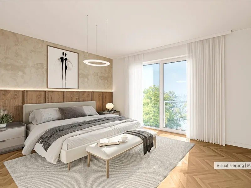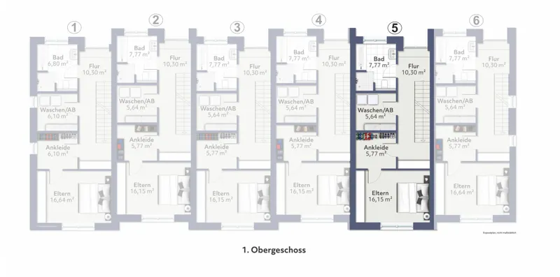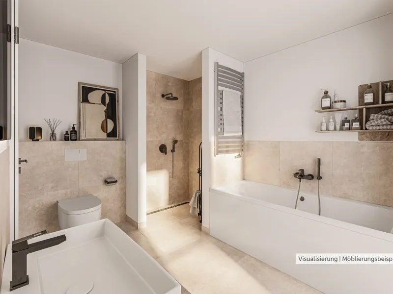 Eine Etage höher eröffnet sich der private Ruhebereich: Ein geräumiges Elternschlafzimmer mit angrenzender Ankleide schafft Komfort und Struktur. Das moderne Badezimmer ist mit einer ebenerdigen Dusche, Badewanne, einem Waschtisch, WC und Handtuchheizkörper ausgestattet. Der praktische Hauswirtschaftsraum mit Anschlüssen für Waschmaschine und Trockner sorgt für kurze Wege und alltagstaugliche Abläufe.
