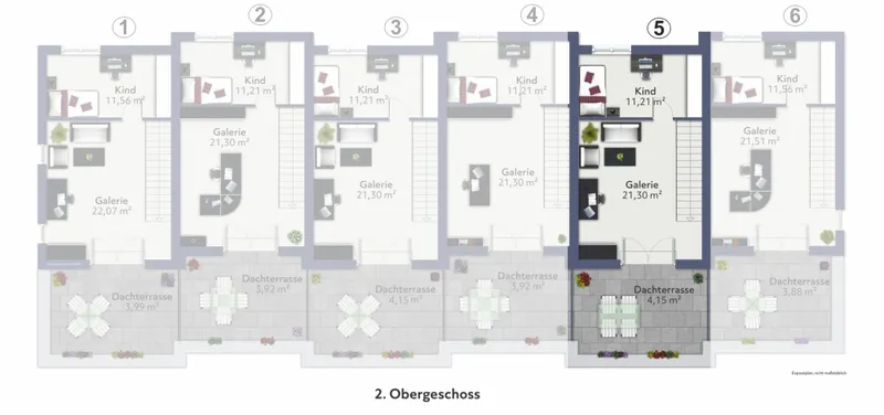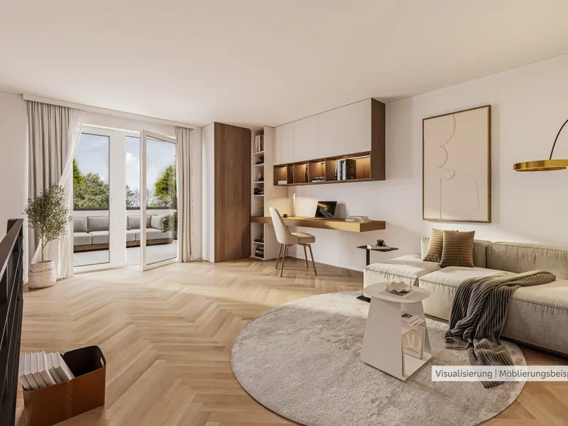 Das 2. Obergeschoss bietet Flexibilität pur: Ein weiteres Zimmer eignet sich ideal als Kinder-, Gäste- oder Arbeitszimmer. Die offene Galerie erweitert die Nutzungsmöglichkeiten – sei es als Homeoffice, Hobbybereich oder Rückzugsort. Von hier aus führt der Weg direkt auf die sonnige Dachterrasse, die als wertvoller zusätzlicher Außenbereich ein echtes Highlight darstellt.