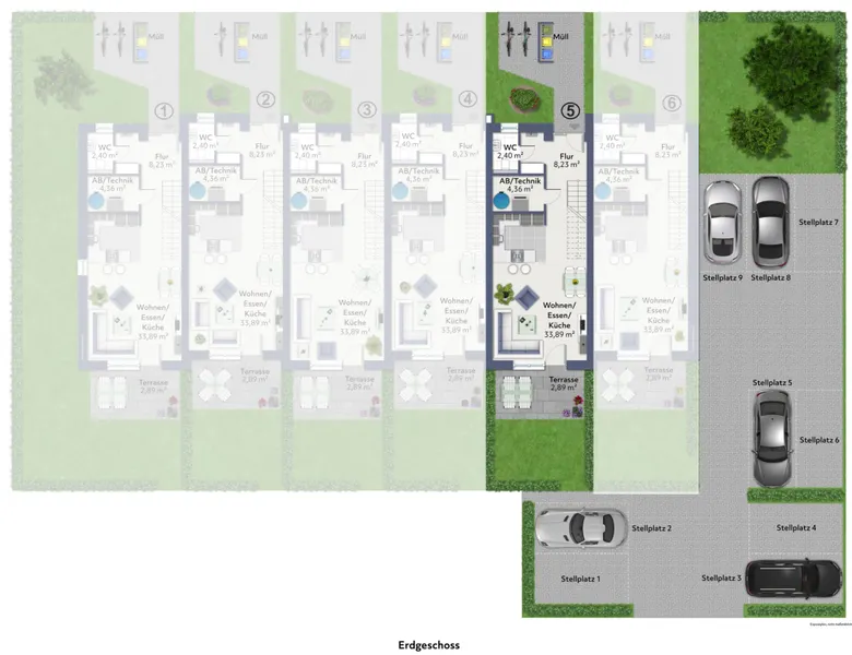 – Eigene Luft-/Wasser-Wärmepumpe pro Haus in Kombination mit Fußbodenheizung