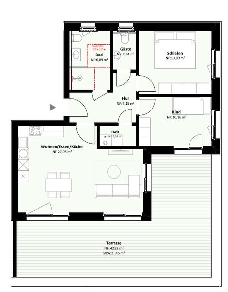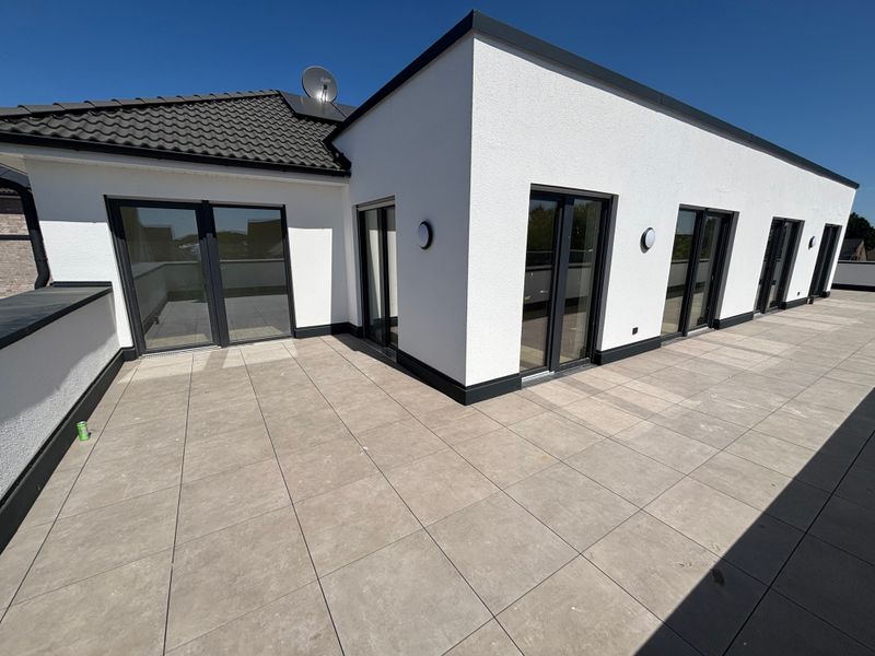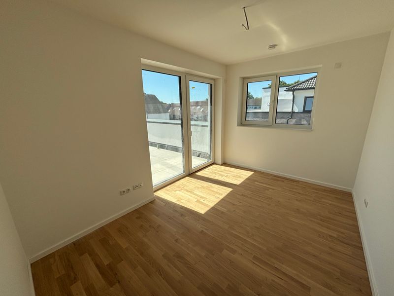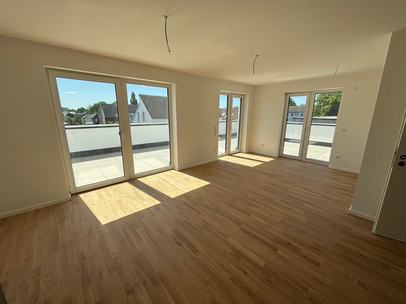 Die Wohnung bietet mit ca. 92 m² Wohnfläche eine hochwertige Ausstattung und durchdachte Raumaufteilung. Nahe des Wohnungseinganges befindet sich ein Hausanschlussraum/ Abstellraum mit Anschlüssen für Waschmaschine und Trockner. Vom Wohnungsflur gelangen Sie ins geräumige Schlafzimmer, ebenso gelangen Sie vom Flur aus in das anliegende Tageslichtbadezimmer mit ebenerdiger Dusche. Neben dem Badezimmer befindet sich das geräumige Gäste-WC. Im südlichen Teil der Wohnung liegt das große Wohn- & Esszimmer mit offener Küche. Von hier aus haben Sie den Zugang zur großzügigen Dachterrasse.