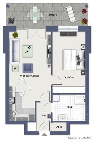 Wohnen mit Leichtigkeit und Stil! Der barrierearme Grundriss überzeugt mit einem hellen Wohn- und Essbereich, einer offen integrierten Küche, einem modernen Badezimmer mit ebenerdiger Dusche und einem praktischen Abstellraum mit Anschlüssen für Waschmaschine und Trockner. Die sonnige Terrasse erweitert den Wohnraum und bietet Ihnen einen gemütlichen Rückzugsort im Freien.