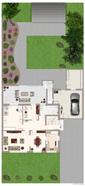 Das Erdgeschoss beeindruckt durch ein offenes Wohn- und Esszimmer, das durch große Fenster lichtdurchflutet ist und eine einladende Atmosphäre schafft. Die angrenzende Küche bietet bequemen Zugang zum Essbereich – perfekt für gesellige Abende und Familientreffen.