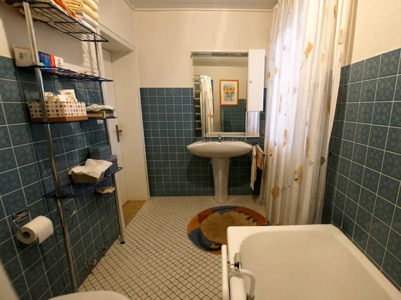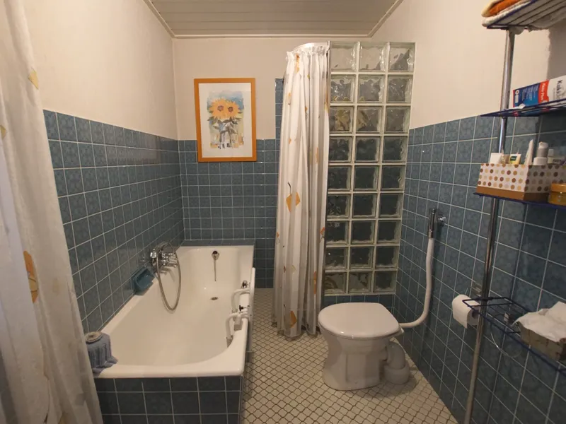 Das Tageslichtbad im Erdgeschoss ist mit einem WC, einem Waschbecken, einer Badewanne und Dusche ausgestattet.