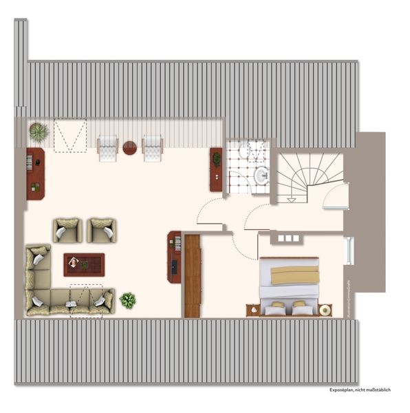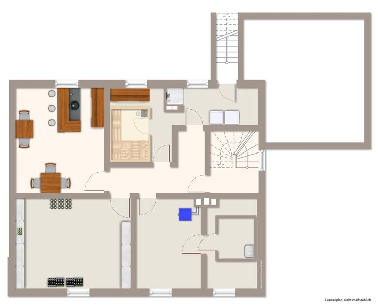 Einladend gestaltet sich auch der Eingangsbereich im Erdgeschoss, der Zugang zu sämtlichen Etagen und Räumlichkeiten gewährt. Eine Treppe verbindet alle Ebenen, vom Keller bis hin zum Dachgeschoss, und rundet das praktische und durchdachte Design dieser Immobilie ab.