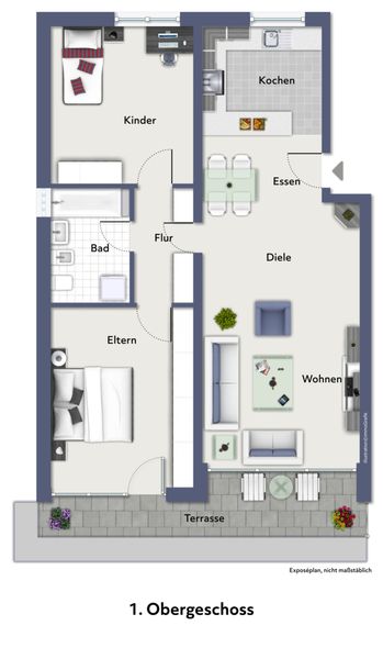 Ein Highlight dieser Wohnung ist das großzügige Dachterrassenparadies mit Südausrichtung, das Sie direkt vom Wohnbereich aus betreten können. Hier tanken Sie von morgens bis abends Sonnenstrahlen und genießen Ihren Kaffee genauso wie laue Sommerabende in privater Atmosphäre. Das zeitlos in dezenten Grautönen gehaltene Badezimmer vereint Dusche und Badewanne – so starten Sie vital in den Tag oder lassen den Alltag stilvoll hinter sich.