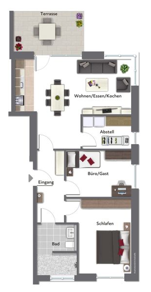 Die Wohnungsgrößen variieren zwischen 54 und 89 Quadratmetern und bieten mit zwei oder drei Zimmern flexible Möglichkeiten für Singles, Paare und kleine Familien. Die Grundrisse sind geprägt von offenen Wohnküchen, die das Herzstück jeder Wohnung bilden und zu geselligen Stunden einladen. Großzügige Terrassen und Balkone erweitern den Wohnraum ins Freie und schaffen Orte der Entspannung mit herrlichem Ausblick auf die grüne Umgebung.
