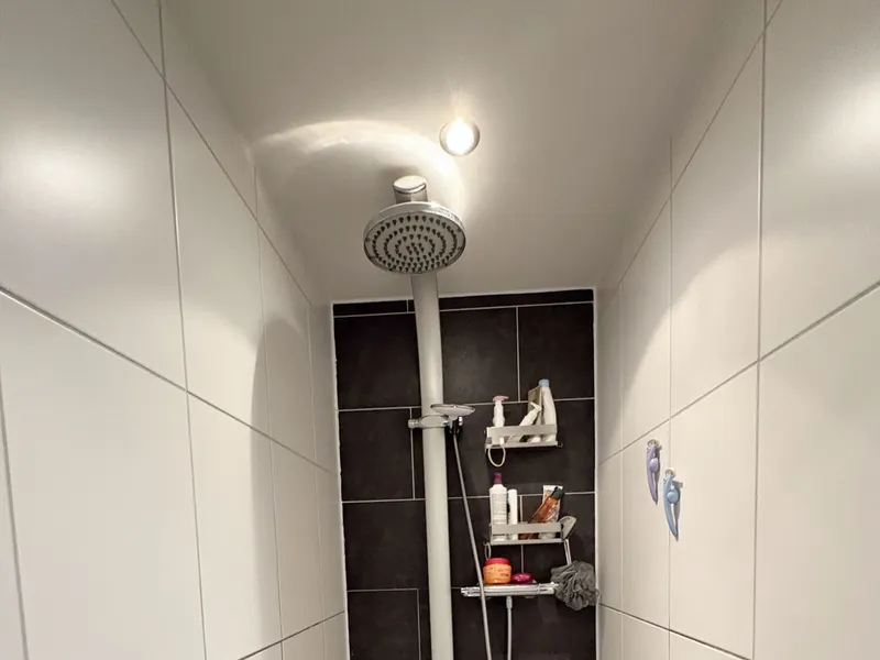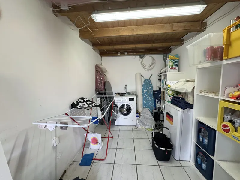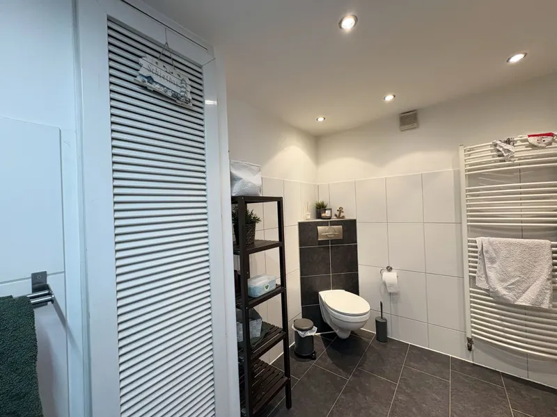 Die Küche zeigt sich in weißer, zeitloser Ausführung und fügt sich unaufgeregt in das Gesamtbild ein, ideal für alle, die klare Linien mögen und dennoch Raum für eigene Akzente lassen möchten. Ergänzend stehen praktische Nebenflächen zur Verfügung, darunter ein Hauswirtschaftsraum, der den Alltag spürbar erleichtert, etwa für Wäsche, Vorräte oder zusätzliche Staumöglichkeiten. Das Badezimmer ist modern gestaltet und verfügt über eine begehbare Dusche, was den Komfort im täglichen Ablauf deutlich erhöht.