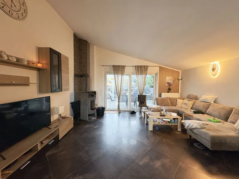 Das Wohnzimmer wirkt durch die großzügige Fensterfläche hell und wird an kühleren Tagen stimmungsvoll durch den Innenkaminofen ergänzt, der dem Raum eine ruhige, wohnliche Mitte gibt. Von hier aus gelangen Sie direkt auf die überdachte Terrasse, die als geschützter Lieblingsplatz funktioniert, vom ersten Kaffee am Morgen bis zum Abendessen im Freien, selbst wenn das Wetter einmal wechselhaft ist. Der Garten auf ca. 604 m² Grundstücksfläche bietet eine angenehme Mischung aus Rasen und befestigten Bereichen, sodass sowohl Spielfläche als auch Platz für Hochbeete, Lounge oder Grillabende denkbar sind.