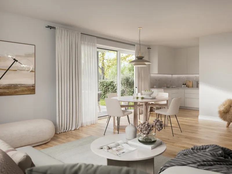 -offener Wohn-Essbereich mit Küche und Zugang zur Terrasse