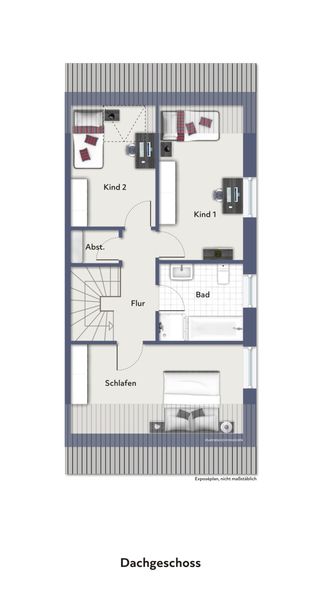 Das Dachgeschoss überzeugt mit einem gut durchdachten Grundriss: Ein gut geschnittenes Elternschlafzimmer, zwei helle Kinderzimmer sowie ein modernes Tageslichtbad mit Dusche und Badewanne bieten viel Platz für die ganze Familie. Ein weiterer Abstell-/Heizungsraum rundet das Platzangebot sinnvoll ab.