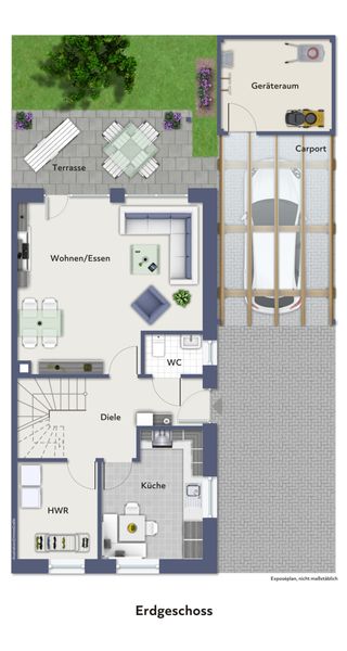 Zu der Doppelhaushälfte ist ein Carport-Stellplatz, ein Geräteraum sowie ein eigener Gartenbereich mit Terrasse zugeordnet.