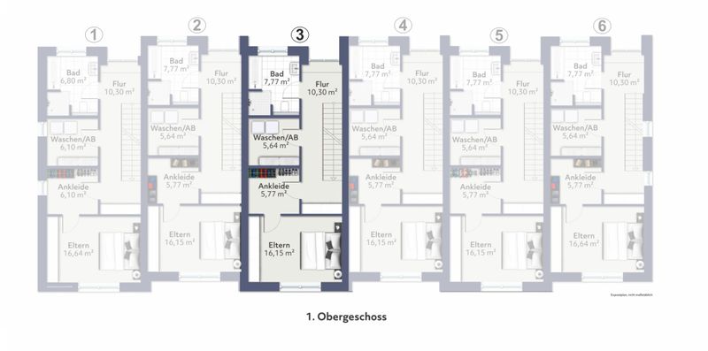 Eine Etage höher eröffnet sich der private Ruhebereich: Ein geräumiges Elternschlafzimmer mit angrenzender Ankleide schafft Komfort und Struktur. Das moderne Badezimmer ist mit einer ebenerdigen Dusche, Badewanne, einem Waschtisch, WC und Handtuchheizkörper ausgestattet. Der praktische Hauswirtschaftsraum mit Anschlüssen für Waschmaschine und Trockner sorgt für kurze Wege und alltagstaugliche Abläufe.