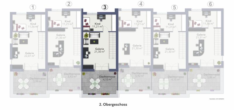 Das 2. Obergeschoss bietet Flexibilität pur: Ein weiteres Zimmer eignet sich ideal als Kinder-, Gäste- oder Arbeitszimmer. Die offene Galerie erweitert die Nutzungsmöglichkeiten – sei es als Homeoffice, Hobbybereich oder Rückzugsort. Von hier aus führt der Weg direkt auf die sonnige Dachterrasse, die als wertvoller zusätzlicher Außenbereich ein echtes Highlight darstellt.