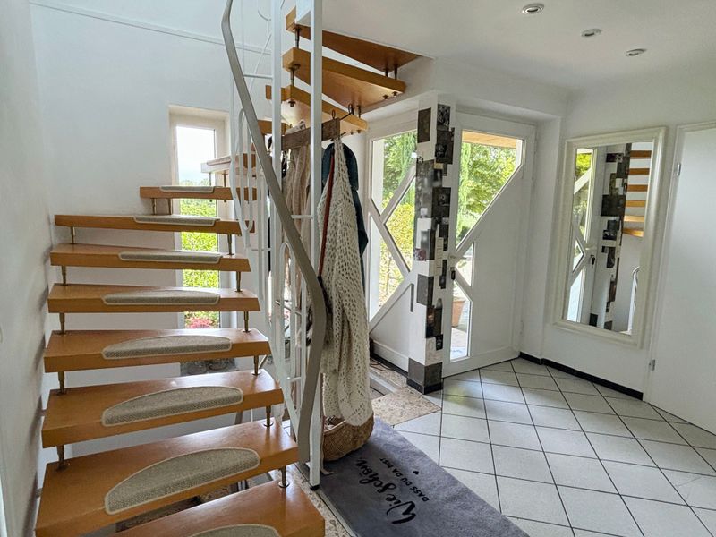 Über einen eigenen Hauseingang an der Gebäudeseite erreichen Sie die Wohneinheit mit rund 177 m² Wohnfläche, die auf Anhieb ein Gefühl von Zuhause vermittelt. Von der Eingangsdiele aus erreichen Sie das Gäste WC und die geräumige Küche mit angrenzendem Ess-/Wohnzimmer und Zugang zum Außenbereich. Ein Arbeitszimmer ist in dem offenen Gesamtkonzept integriert und kann bei Bedarf auch noch abgetrennt werden. Ein Highlight ist die großzügige Sauna, welche einen idyllischen Blick in die Natur bietet.