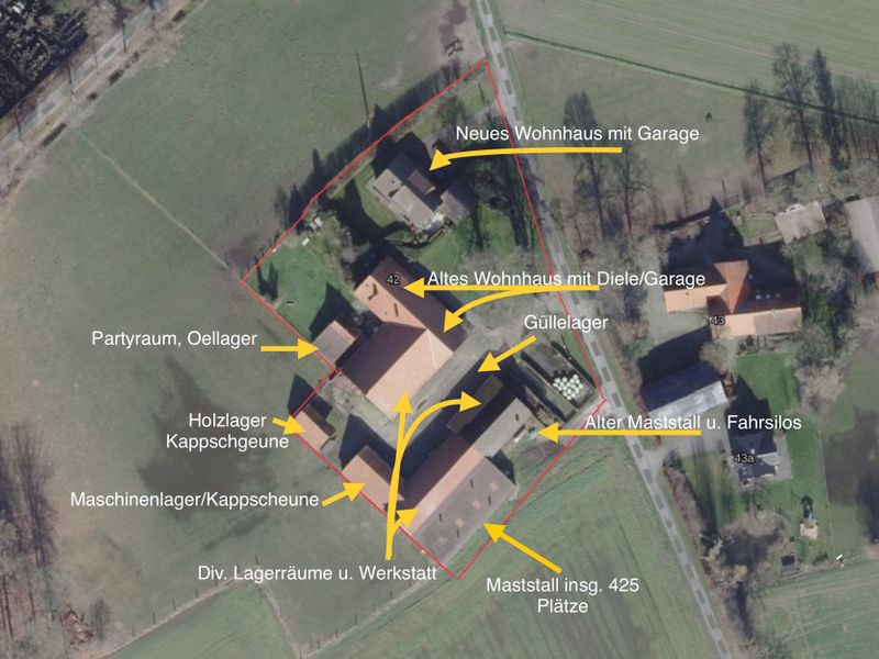 Der freistehende Neubau aus dem Jahr 1995 wurde sehr hochwertig und sehr solide errichtet und verfügt über eine Wohnfläche von offiziell 185,42 m². Hier findet man alle Annehmlichkeiten und den Komfort, welches modernes Wohnen ausmacht, sowie ein überaus reichhaltiges und großzügiges Raumangebot. Zudem ist das Haus komplett unterkellert. Die angrenzende übergroßen Garage ist im DG nochmals mit einen großen Lagerraum versehen. Sozialräume, Abstellräume und mögliche Ausbaureserven sind ebenso vorhanden, wie weitere Nebengebäude, die als Scheune, Lagerraum, Pferdestall o. ä. dienen können. Auf der Hofstelle befindet sich ferner ein Schweinemaststall mit ca. 425 Mastplätzen und ein weiterer Vormaststall, der aber nicht mehr genutzt wird. Die Fütterungsanlage und die Futterlager sind Eigentum des Pächters.
