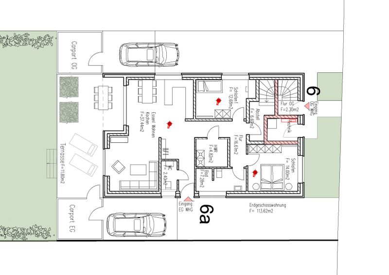 Zu der Wohnung gehört ein eigener Garten mit großer Terrasse, die teils überdacht ist und ein Carport mit Geräteraum sowie ein zusätzlicher Stellplatz.