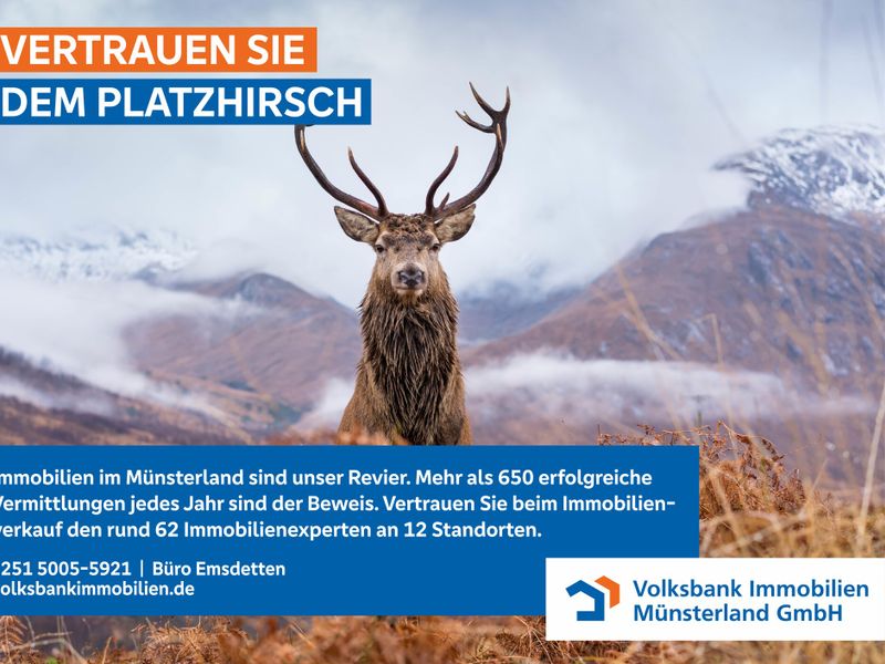 Emsdetten, eine junge aufstrebende Stadt mit hervorragender Infrastruktur, wirtschaftsfreundlichem Klima und höchster Lebensqualität. Die Stadt bietet mit ca. 36.700 Einwohnern einen idealen Ort zum Wohnen, Leben und Arbeiten, zentrumsnah und doch im Grünen. Die Vielzahl an Kindergärten und Kindertagesstätten sowie alle Schulformen mit Grund- oder Halbtagsangeboten machen Emsdetten als Wohnort bei jungen Familien besonders attraktiv. Vorzügliche Bildungs-, Betreuungs-, Kultur- und Freizeitangebote unterstreichen die Attraktivität der Stadt. Hinzu kommt das schöne „Waldbad“, hier lädt sowohl das Hallen- als auch das Freibad zum Badespaß ein! Neben zwei Wochenmarkttagen mit beliebten Angeboten aus der Region lockt die Innenstadt mit regelmäßigen Veranstaltungen im Bereich Musik, Comedy, Theater und Sport. Abwechslungsreiche Einzelhandelsangebote und eine vielfältige Gastronomie runden das Angebot ab. Der ständige Ausbau des Geh- und Radwegenetzes macht das Fahrrad in Emsdetten zum beliebten Fortbewegungsmittel. Vom Emsdettener Bahnhof in Citylage haben Sie direkten Anschluss nach Münster und Rheine. Den Flughafen FMO erreichen Sie mit dem PKW in ca. 20 min. Münster in ca. 30 Minuten.
