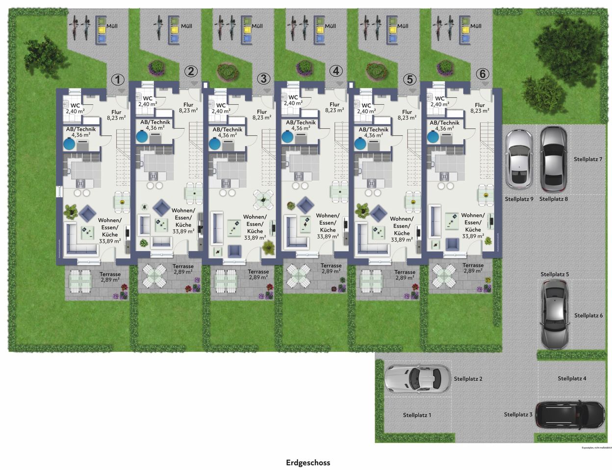 – Eigene Luft-/Wasser-Wärmepumpe pro Haus in Kombination mit Fußbodenheizung