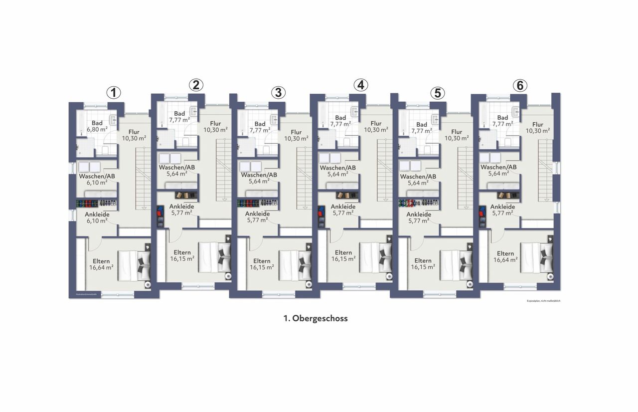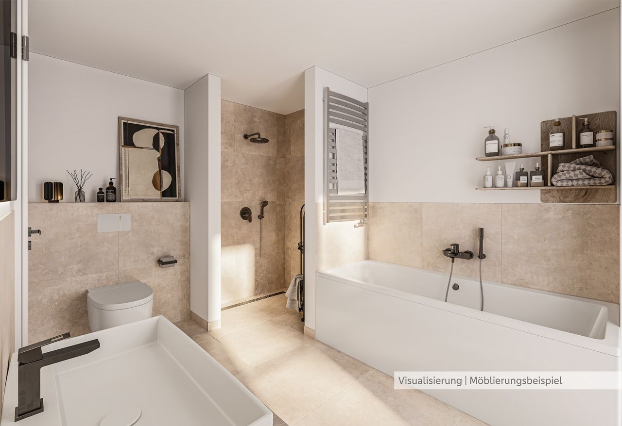 Eine Etage höher eröffnet sich der private Ruhebereich: Ein geräumiges Elternschlafzimmer mit angrenzender Ankleide schafft Komfort und Struktur. Das moderne Badezimmer ist mit einer ebenerdigen Dusche, Badewanne, einem Waschtisch, WC und Handtuchheizkörper ausgestattet. Der praktische Hauswirtschaftsraum mit Anschlüssen für Waschmaschine und Trockner sorgt für kurze Wege und alltagstaugliche Abläufe.