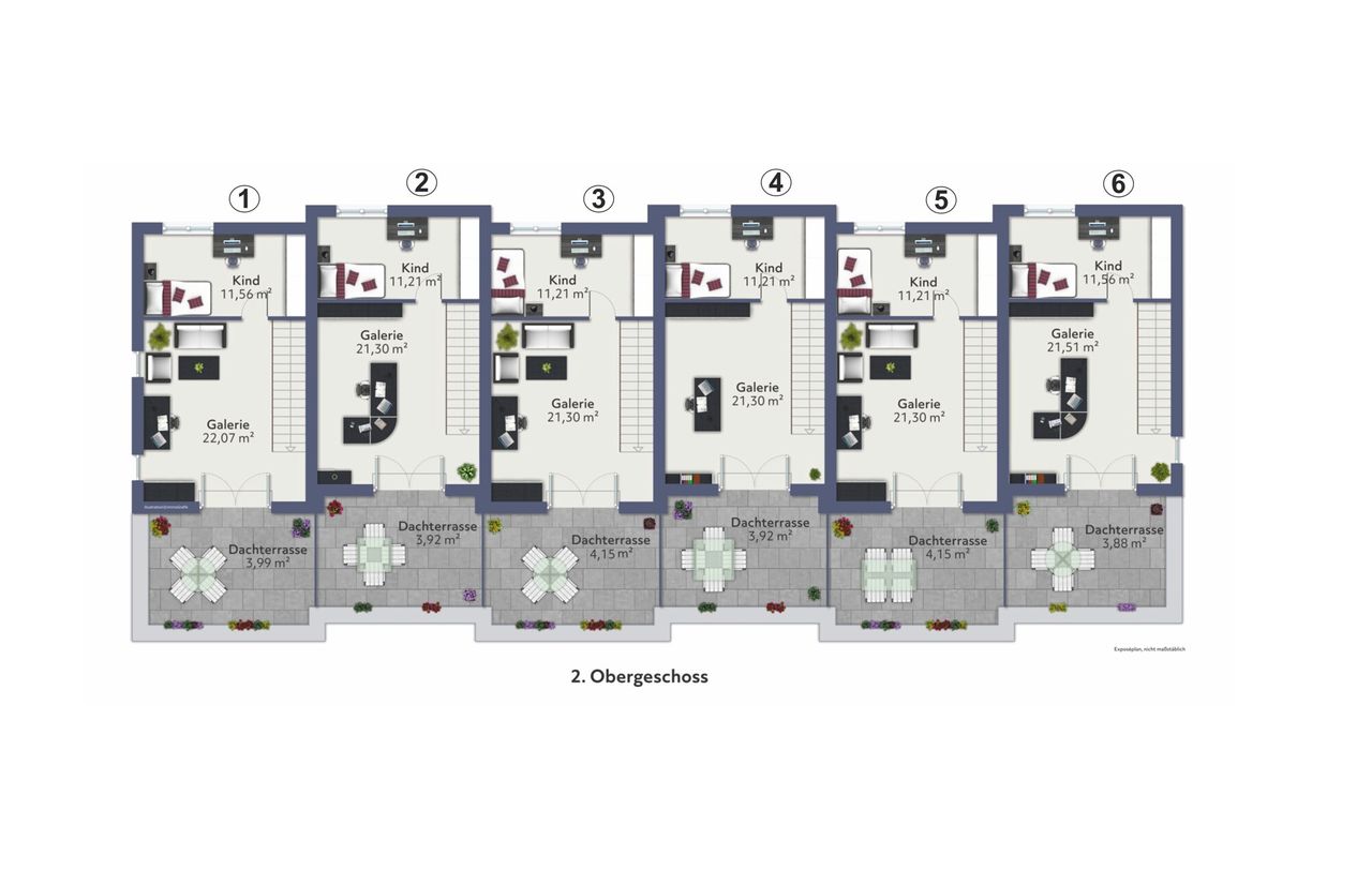 Das 2. Obergeschoss bietet Flexibilität pur: Ein weiteres Zimmer eignet sich ideal als Kinder-, Gäste- oder Arbeitszimmer. Die offene Galerie erweitert die Nutzungsmöglichkeiten – sei es als Homeoffice, Hobbybereich oder Rückzugsort. Von hier aus führt der Weg direkt auf die sonnige Dachterrasse, die als wertvoller zusätzlicher Außenbereich ein echtes Highlight darstellt.
