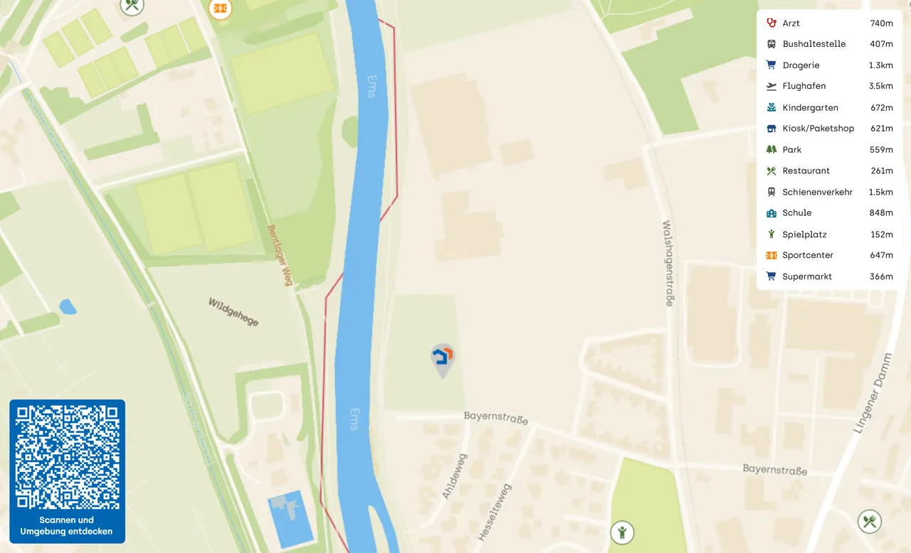 – Ob zu Fuß, per Fahrrad oder mit dem PKW – das Baugebiet bietet den idealen Ausgangspunkt für Ihre Unternehmungen. Wählen Sie zwischen Spaziergang entlang der Emspromenade zum historischen Marktplatz oder der Erledigung von Einkäufen des täglichen Bedarfs unter der Nutzung der neu geschaffenen Geh- und Radwege im nahen Umfeld.